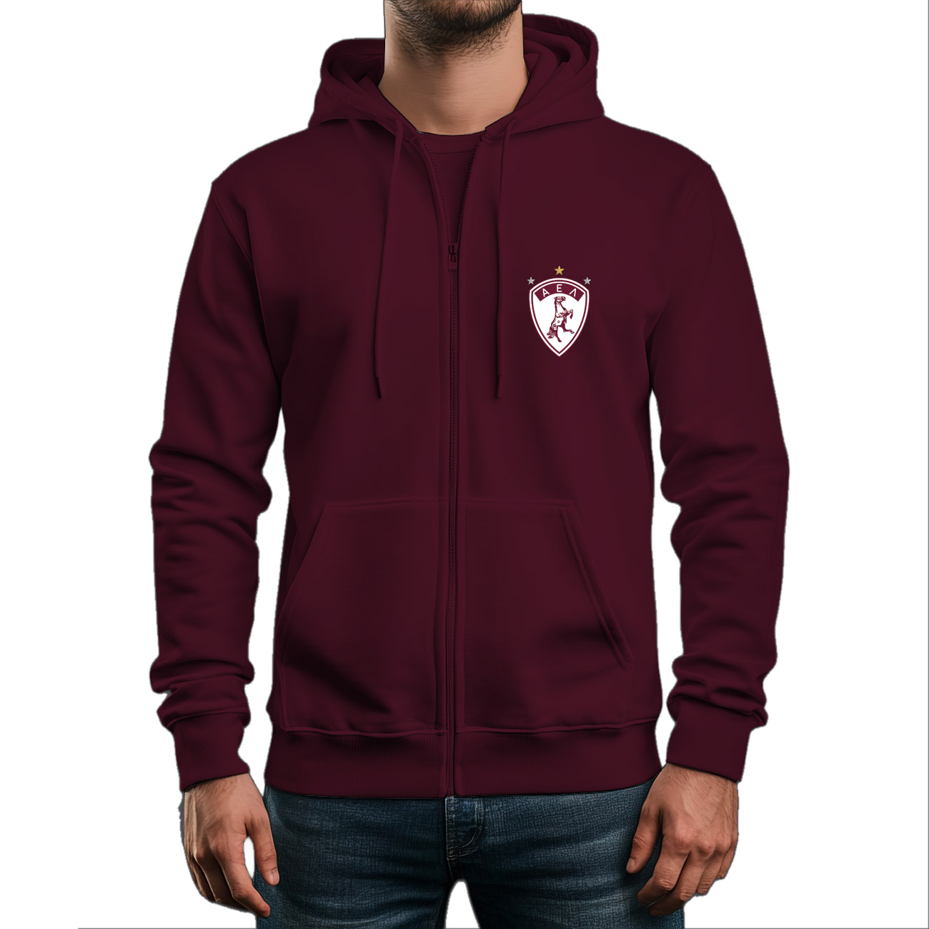 Τίμησε τη "Βυσσινί Θύελλα" εντός κι εκτός γηπέδου, με την ανδρική ζακέτα AEL FC! Η ανδρική ζακέτα διαθέτει ρυθμιζόμενη κουκούλα με κορδόνι και πλαϊνές τσέπες για τα καθημερινά σου αντικείμενα. Το έμβλημα της ΑΕΛ με το αγέρωχο άλογο δείχνει περίτρανα την πίστη σου στην αγαπημένη ομάδα της Λάρισας.
